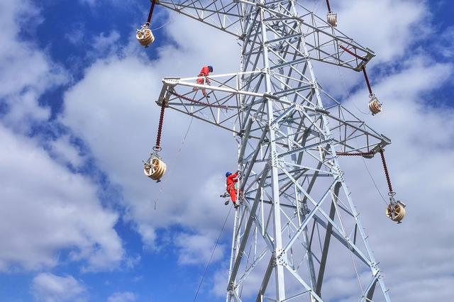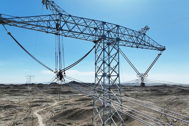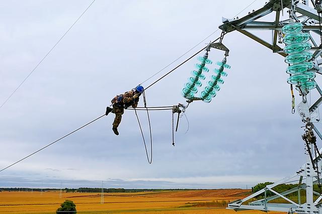 國(guó)網(wǎng)甘肅電力施工人員在哈密—重慶±800千伏特高壓直流輸電工程開(kāi)展架線自檢。
