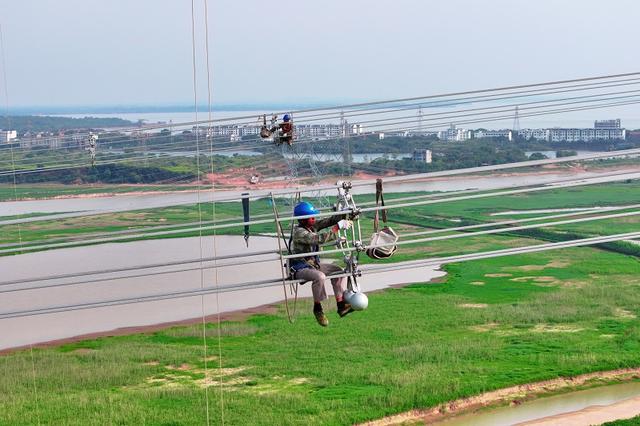 國(guó)網(wǎng)江西電力建設(shè)公司施工人員在武漢—南昌1000千伏雙回線路工程安裝間隔棒。