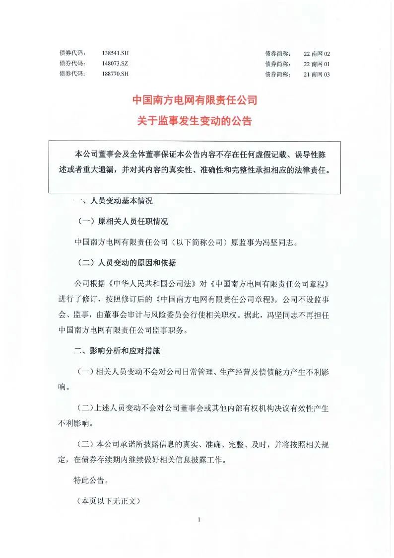 2月11日,中國(guó)南方電網(wǎng)有限責(zé)任公司發(fā)布關(guān)于監(jiān)事發(fā)生變動(dòng)的公告。公司根據(jù)《中華人民共和國(guó)公司法》對(duì)《中國(guó)南方電網(wǎng)有限責(zé)任公司章程》進(jìn)行了修訂,按照修訂后的《中國(guó)南方電網(wǎng)有限責(zé)任公司章程》,公司不再設(shè)監(jiān)事會(huì)、監(jiān)事,由董事會(huì)審計(jì)與風(fēng)險(xiǎn)委員會(huì)行使相關(guān)職權(quán)。據(jù)此,馮堅(jiān)同志不再擔(dān)任中國(guó)南方電網(wǎng)有限責(zé)任公司監(jiān)事職務(wù)。