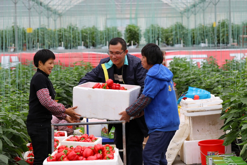 大棚種植基地迎來豐收喜悅,小婷媽媽和高鋒一起搬運(yùn)豐收的彩椒。孫嘉彪 攝
