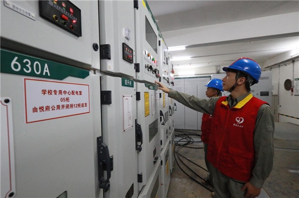 與此同時,在黃陂區(qū)第一中學,服務隊員仔細查看了校園內(nèi)的用電設備使用情況。由于暑假期間學校的電氣設備大多處于閑置無負荷狀態(tài),加之夏季高溫、暴雨等多種因素影響,開學后校園用電負荷將大幅增長,容易導致用電設備出現(xiàn)短路、漏電等安全隱患。服務隊員根據(jù)學校的實際情況,逐一檢查校內(nèi)配電室的高低壓柜、變壓器、備用電源以及教學樓、食堂等處的用電線路及用電設備,對學校內(nèi)部線路絕緣老化、進出線連接不規(guī)范、開關(guān)接觸不良等問題及時處理,積極配合校方進行整改,確保學校用電設備在開學之前全部正常運轉(zhuǎn)。“根據(jù)咱們學校的用電負荷特點,我們優(yōu)化了供電線路的布局,也合理調(diào)整了變壓器的運行檔位,制定了詳細的專項保供電方案,并與學校建立聯(lián)動機制,確保開學時的正常供電。”服務隊員一邊進行安全用電檢查,一邊對學校后勤相關(guān)負責人說道。
