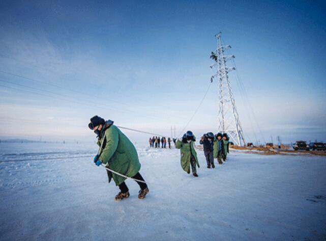 11月25日,錫林郭勒盟蘇尼右旗滴水成冰,20多名身著軍大衣、頭戴棉質(zhì)安全帽的工人在白雪皚皚的草原深處喊著號(hào)子、齊力拉著導(dǎo)引繩,拖拽著身后近30米高的鐵塔。鐵塔上站著的幾個(gè)工人,正吃力地加固塔上的導(dǎo)線。不遠(yuǎn)處挖掘機(jī)、轉(zhuǎn)載機(jī)隆隆作響,一片如火如荼的繁忙景象。