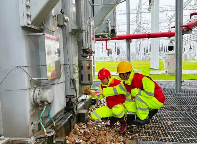20日中午,在1000千伏練塘站,站長(zhǎng)兼支部書記周勇趁著雨勢(shì)稍微減小再一次帶領(lǐng)運(yùn)維人員來到戶外設(shè)備區(qū)開展特巡,檢查特高壓主變運(yùn)行情況。連著中秋假期,周勇與站里的黨員們已經(jīng)連續(xù)奮戰(zhàn)了近一周,雖然很疲憊,但大家的目標(biāo)都是一致的——全力確保變電站可靠供電。