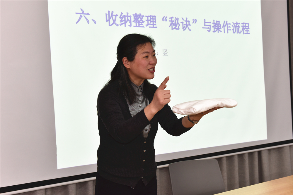 此次活動(dòng)邀請(qǐng)了高級(jí)整理收納師為大家分享了收納中需要遵守的“斷離舍”原則,從收納理念、收納工具的選擇到家居衣物的懸掛方式、衣物折疊法等方面著手,從理論到實(shí)操,寓教于樂、深入淺出,為大家?guī)砹艘惶糜腥ぁ?shí)用的課程。培訓(xùn)后,參訓(xùn)職工分小組進(jìn)行了收納比賽,比賽過程中,選手們學(xué)以致用,揮灑自如、得心應(yīng)手,取得了優(yōu)異的成績(jī)。