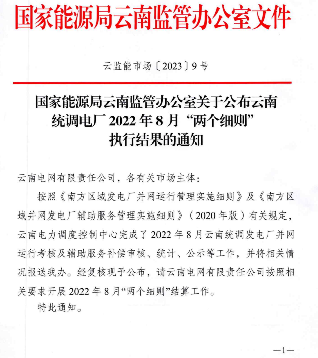 1月19日,國家能源局云南監(jiān)管辦公室公布云南統(tǒng)調(diào)電廠2022年8月“兩個細則”執(zhí)行結(jié)果。