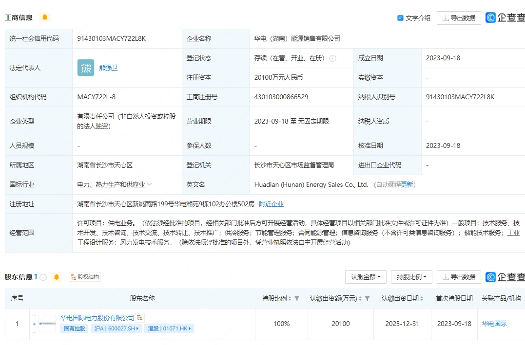 企查查APP顯示,近日,華電(湖南)能源銷售有限公司成立,法定代表人為熊強衛(wèi),注冊資本2億余元,經(jīng)營范圍包含:儲能技術(shù)服務(wù);工業(yè)工程設(shè)計服務(wù);風力發(fā)電技術(shù)服務(wù)等。企查查股權(quán)穿透顯示,該公司由華電國際100%控股。(每日經(jīng)濟新聞)
