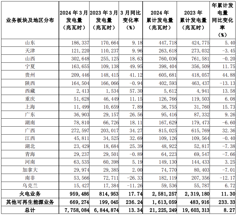 截至2024年3月31日,本公司2024年累計完成發(fā)電量21,225,249兆瓦時,較2023年同期同比增長8.27%。其中,風(fēng)電發(fā)電量增長1.37%,火電發(fā)電量增長11.30%,其他可再生能源發(fā)電量增長233.33%。2024年3月發(fā)電量詳情如下: