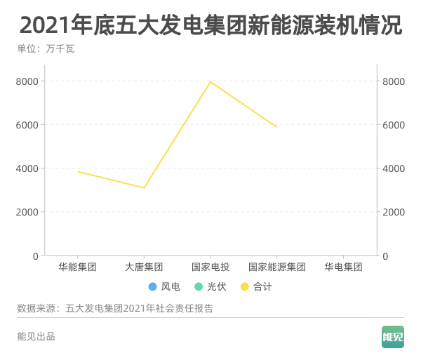 從折線斜率可以清晰看出,只有國(guó)家能源集團(tuán)2021年新增裝機(jī)量高于2020年,華能、大唐、國(guó)家電投三家則2021年增量低于2020年,華電缺失數(shù)據(jù)(僅發(fā)布新聞,未發(fā)布完整版報(bào)告)。