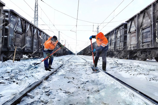 信號工清理鐵道線路積雪