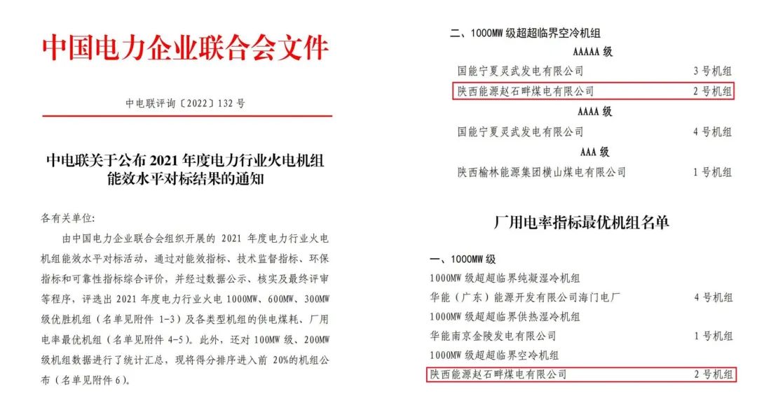 中國電力網(wǎng)訊  6月29日,從中電聯(lián)傳來喜訊,趙石畔煤電公司2號機組榮獲2021年度電力行業(yè)1000MW級超超臨界空冷機組指標(biāo)對標(biāo)“AAAAA級優(yōu)勝機組”及“廠用電率指標(biāo)最優(yōu)機組”。