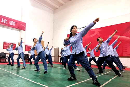 該公司職工利用工作間隙集中教學(xué)練習(xí),他們用心學(xué),認(rèn)真做,力求每個(gè)動(dòng)作規(guī)范到位。“哈哈,這拉弓的姿勢(shì),牛!”“出道了,整套動(dòng)作都get到了!”通過(guò)一遍遍的練習(xí)、糾正,大家的動(dòng)作越來(lái)越順暢、舒展,變得活力四射,賞心悅目。