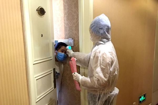 圖為:蘭豐堅(jiān)守戰(zhàn)“疫”前線,為人民群眾測(cè)量體溫