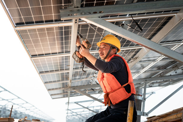 7分鐘,張志輝擰緊了光伏面板支架上的最后一顆螺栓,被汗水浸潤(rùn)的古銅色臉龐上露出勝利的笑容;