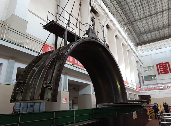 該公司密切關(guān)注本次轉(zhuǎn)輪室吊裝作業(yè),2號(hào)機(jī)組轉(zhuǎn)輪室上半部重約16噸,為確保本次吊裝工作的順利進(jìn)行,該公司根據(jù)現(xiàn)場(chǎng)情況,對(duì)參與本次吊裝工作的全體人員進(jìn)行安全技術(shù)交底,所有工作人員清楚工作內(nèi)容、方法和要求。同時(shí)監(jiān)督吊裝作業(yè)各項(xiàng)措施全部落實(shí)到位,明確各項(xiàng)責(zé)任。在吊裝過程中,工作負(fù)責(zé)人和橋機(jī)指揮人員密切關(guān)注轉(zhuǎn)輪室擺動(dòng)幅度,及時(shí)進(jìn)行方位調(diào)整,各部位設(shè)專人負(fù)責(zé),各環(huán)節(jié)做到無縫銜接,最終圓滿完成了2號(hào)機(jī)組轉(zhuǎn)輪室上半部吊裝工作。