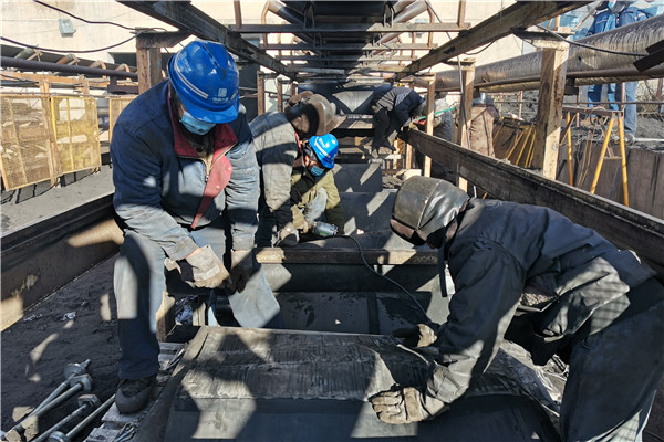 5日上午,工作人員做好粘接皮帶準(zhǔn)備工作,負(fù)責(zé)這次搶修工作的皮帶班,目前編制只有三名職工,承擔(dān)此次工作,顯然兩天內(nèi)完不成皮帶粘接任務(wù),燃運(yùn)分場打破常規(guī),合理分配人員,調(diào)派分場其他班組支援搶修,在剛剛完成三天搶修任務(wù)的情況下,克服困難繼續(xù)投入到搶修中。他們分工作業(yè)、分組負(fù)責(zé),一組用電火焊、導(dǎo)鏈、撬棍等工具修復(fù)皮帶滾筒,一組對斷裂皮帶進(jìn)行切割、打磨、對口、清洗、粘接和硫化等處理,同樣是在室外寒冷天氣搶修,汗水浸濕了他們的衣領(lǐng)和帽子,加上空間狹小,他們克服了重重困難,團(tuán)結(jié)作戰(zhàn),中午來不及休息,午飯后又繼續(xù)搶修工作,沒有一個人叫苦叫累,以頑強(qiáng)的毅力完成了當(dāng)天的皮帶粘接任務(wù)。