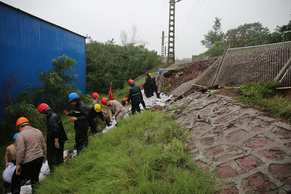 “鐵路專用線路場外區(qū)域索河鐵路大橋北段西側(cè)600米處護(hù)坡出現(xiàn)部分坍塌,我已撤到安全區(qū)域!”20日11時20分,巡線人員向指揮部報告。如果鐵路出了問題將無法運(yùn)煤,沒有煤機(jī)組只能停運(yùn),指揮部的人員聽到這個消息都出了一身冷汗。2臺轉(zhuǎn)載機(jī)1臺運(yùn)輸卡車立即到位,80余名黨員突擊隊員冒著大雨迅速來到塌方處,用石子、沙土等加固鐵路護(hù)坡,防止險情繼續(xù)擴(kuò)大。