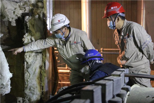 此次消缺期間室外最低氣溫達(dá)到零下20度左右,防寒防凍無(wú)疑是消缺工作的重中之重,長(zhǎng)山廠及時(shí)切換供熱方式,利用化廠備用熱源為家屬區(qū)供熱,同時(shí)也為防寒防凍工作、機(jī)組順利啟動(dòng)提供可靠保證。在此期間,各單位各負(fù)其責(zé),全員行動(dòng),全面開展防寒防凍工作。發(fā)電部作為主體責(zé)任部門,從主任到單元長(zhǎng),從值班員到巡檢員,明確區(qū)域,認(rèn)真排查,每小時(shí)測(cè)量廠房所有區(qū)域溫度,同時(shí)對(duì)門窗封閉、室外管路保溫等防寒防凍措施進(jìn)行再次確認(rèn);設(shè)備部一方面制定方案組織相關(guān)單位消缺,一方面全面安排部署極寒天氣下的防寒防凍工作;各車間(分場(chǎng))在生產(chǎn)廠房各層重要部位設(shè)置炭火爐,對(duì)熱控表管表計(jì)、電氣電子間盤柜、氨區(qū)管路進(jìn)行檢查,增加伴熱帶,設(shè)置值班人員監(jiān)測(cè)環(huán)境溫度,全力以赴確保防寒防凍工作萬(wàn)無(wú)一失。消缺期間,行政事務(wù)部積極做好后勤保障工作,按時(shí)準(zhǔn)備盒飯送到現(xiàn)場(chǎng),助力消缺工作順利完成。