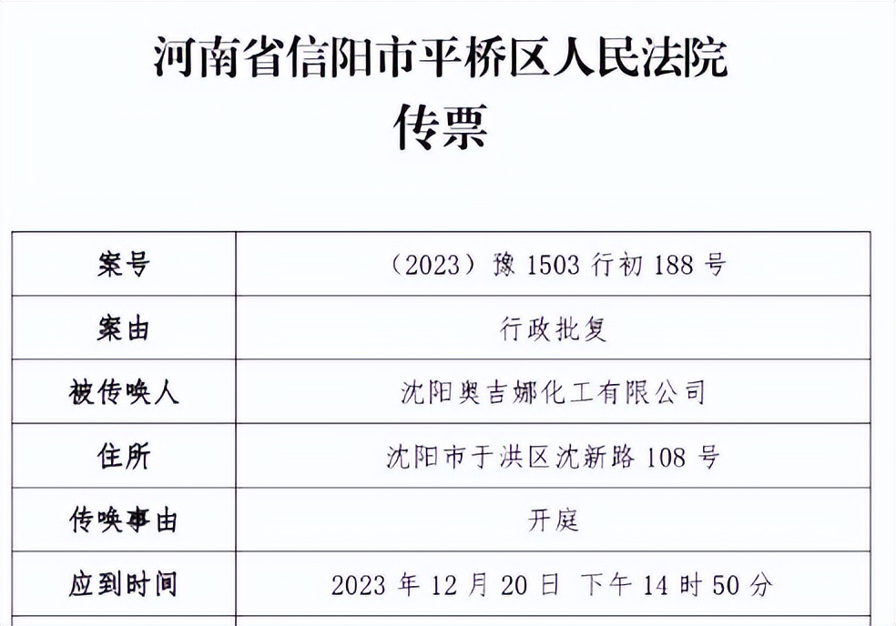 2023年12月1日,中國風(fēng)電潤滑油龍頭企業(yè)沈陽奧吉娜化工有限公司(下簡稱奧吉娜公司)收到河南省信陽市平橋區(qū)人民法院開庭傳票,奧吉娜公司訴信陽市生態(tài)環(huán)境局和第三人華陽長青投資有限公司行政訴訟案,將于2023年12月20日14時(shí)50分開庭審理。屆時(shí),這起風(fēng)電潤滑油央企招投標(biāo)“民告官”第一案結(jié)果如何,讓我們拭目以待。