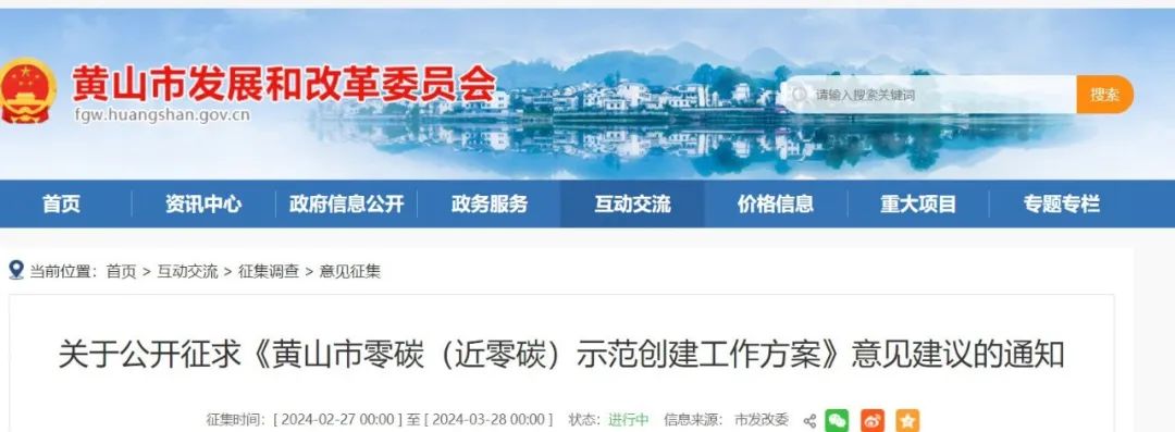 近日,安徽黃山市發(fā)改委發(fā)布關(guān)于公開征求《黃山市零碳(近零碳)示范創(chuàng)建工作方案》意見建議的通知。