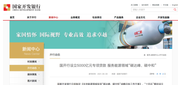 近期,國家開發(fā)銀行制定《支持能源領(lǐng)域?qū)崿F(xiàn)“碳達(dá)峰、碳中和”戰(zhàn)略目標(biāo)工作方案》,“十四五”期間設(shè)立總規(guī)模為5000億元(等值人民幣,含外匯)的能源領(lǐng)域“碳達(dá)峰、碳中和”專項(xiàng)貸款,其中2021年安排發(fā)放1000億元,助力構(gòu)建清潔低碳安全高效的能源體系。