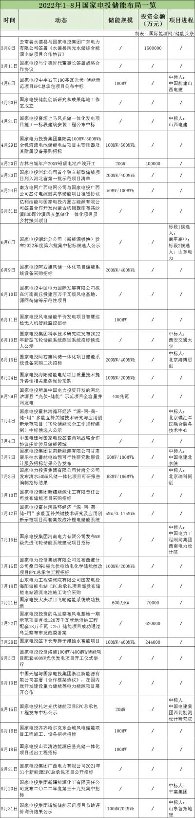 據(jù)不完全統(tǒng)計,2022年1-8月,國家電投與寧德時代、中國電建、中國天楹等簽訂合作協(xié)議,圍繞儲能材料、風光氫儲、重力儲能等方面進行合作。儲能項目招標26個,涉及飛輪儲能、液流電池、鉛炭電池、抽水蓄能及智慧新能源等方面。
