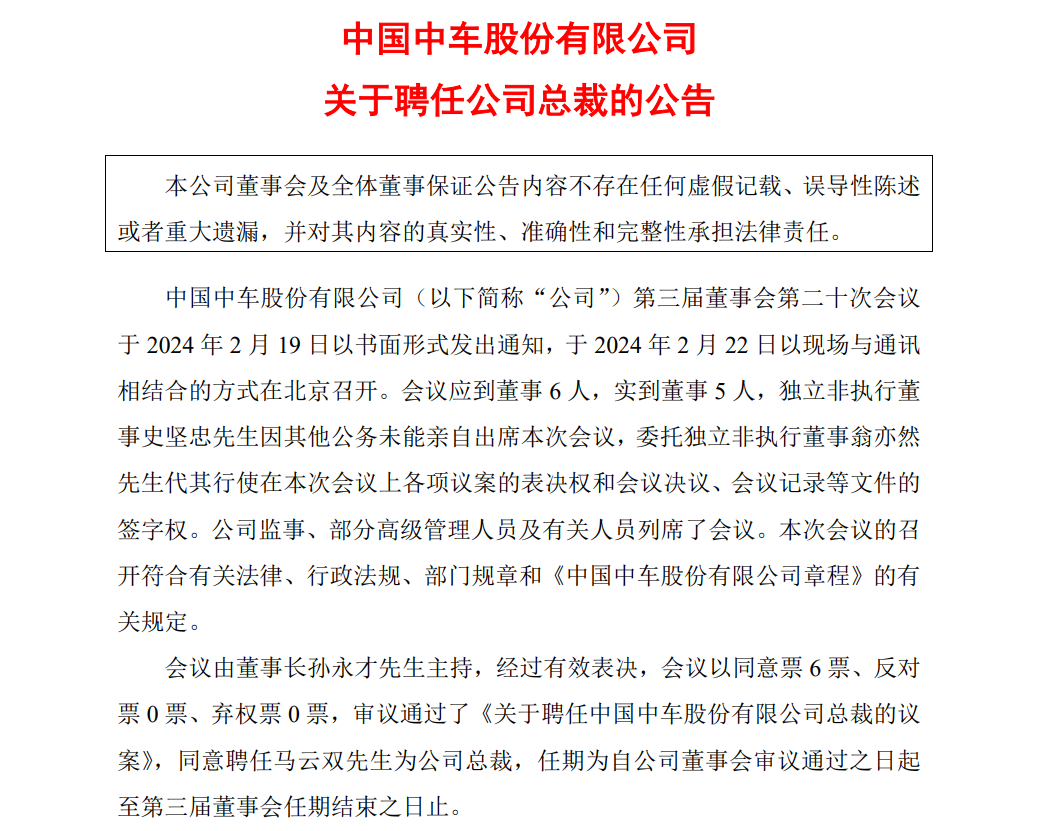 公告披露,中國(guó)中車(chē)召開(kāi)第三屆董事會(huì)第二十次會(huì)議,審議通過(guò)了《關(guān)于聘任中國(guó)中車(chē)股份有限公司總裁的議案》,同意聘任馬云雙先生為公司總裁,任期為自公司董事會(huì)審議通過(guò)之日起至第三屆董事會(huì)任期結(jié)束之日止。