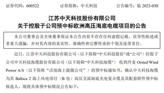 公告披露,中天科技控股子公司中天科技海纜股份有限公司(以下簡稱“中天科技海纜”) 收到丹麥 Orsted Wind Power A/S(以下簡稱“沃旭海上能源公司”)的預(yù)中標(biāo)通知書,確認(rèn)中天科技海纜為其 Baltica 2 海上風(fēng)電項(xiàng)目(B 包)的預(yù)中標(biāo)候選人,中標(biāo)產(chǎn)品為275kV高壓交流海底光電復(fù)合纜以及配套附件,中標(biāo)金額約1.59億歐元(折合人民幣約12.09億元)。