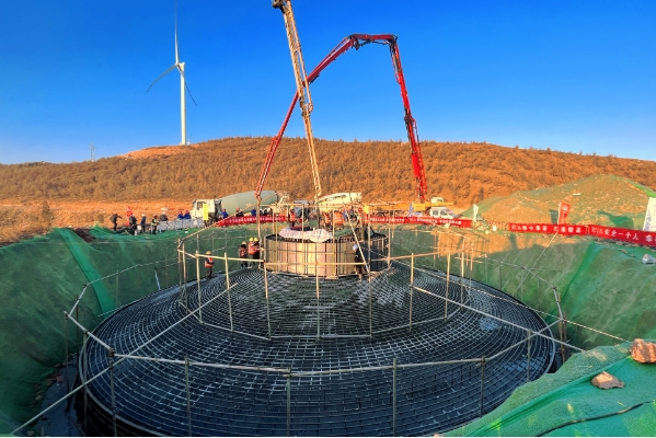 在河南省嵩縣項目建設現(xiàn)場,一派熱火朝天的施工景象。嚴寒天氣中,中國節(jié)能首個產(chǎn)業(yè)助力鄉(xiāng)村振興重點項目——中節(jié)能嵩縣九皋鎮(zhèn)風電場項目工程現(xiàn)場塔吊林立,運輸車輛往來穿梭,基礎澆筑井然有序,以一個個風機基礎構成的“同心圓”應了農(nóng)歷新年“和美團圓”之意。