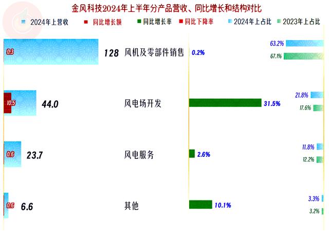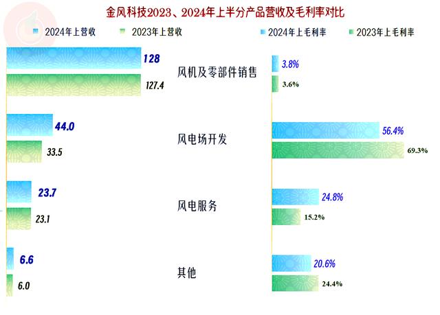 2024年上半年,金風(fēng)科技核心的“風(fēng)機及零部件銷售”業(yè)務(wù)毛利率小幅增長,但總體水平仍然很低;“風(fēng)電場開發(fā)”業(yè)務(wù)的毛利率雖然大幅下降,但仍然超過了五成;“風(fēng)電服務(wù)”業(yè)務(wù)的毛利率有較大幅度增長,對平均毛利率的提升起到了不小的作用。