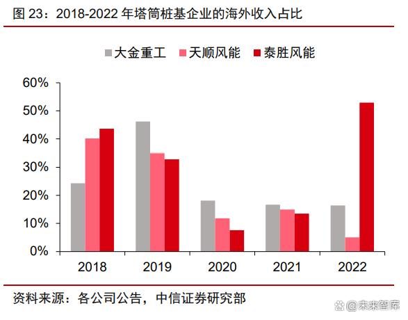 國內(nèi)企業(yè)塔筒出海勢頭加速,單樁出口實現(xiàn)突破。大金重工、天順風能、泰勝風能的 出口比例接近,國內(nèi)企業(yè)以出口塔筒產(chǎn)品為主,海外客戶的供應商體制使有出口業(yè)績的公 司具備更好的客戶端優(yōu)勢;樁基因運輸效率低和方案不成熟的問題,需求仍主要由海外本 地產(chǎn)能滿足。根據(jù)大金重工公告,公司憑其基礎(chǔ)設(shè)施、港口條件和工藝裝備和對海外業(yè)務 的加大投入,于 2022 年攬入 6 項海風海外項目,包括 5 項歐洲項目,成為國內(nèi)首家管樁 產(chǎn)品出口歐洲的企業(yè),打開國產(chǎn)樁基的歐洲市場。