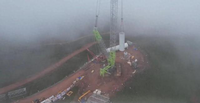 項(xiàng)目團(tuán)隊(duì)為了確保萬無一失,在吊裝前反復(fù)推演。作為最后一臺風(fēng)機(jī)吊裝的主吊設(shè)備,最終通過中聯(lián)重科履帶式起重機(jī)的起升臂配合風(fēng)機(jī)葉片專用夾持工裝,將長97.3m的葉片吊起并與相當(dāng)于33層樓高的輪轂完成精準(zhǔn)對接。