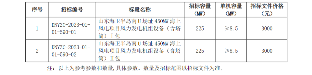 此次招標(biāo)共劃分為2個(gè)標(biāo)段,招標(biāo)包I、包II標(biāo)段供貨范圍為總裝機(jī)規(guī)模 450MW、單臺機(jī)組容量 8.5MW及以上的海上風(fēng)力發(fā)電機(jī)組設(shè)備(整個(gè)項(xiàng)目可上浮小于 1臺單機(jī)容量)及塔筒和配套服務(wù),具體供貨及服務(wù)范圍包括但不限于: