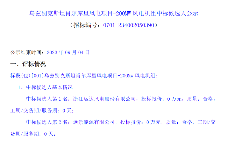 公告顯示,第一中標候選人:浙江運達風電股份有限公司。第二中標候選人:遠景能源有限公司。第三中標候選人:中車株洲電力機車研究所有限公司。