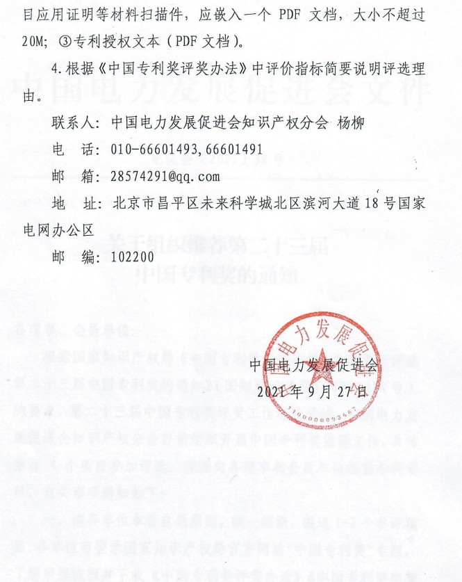 三、請申報單位按照要求,認真填寫《中國專利獎申報書》及相關材料,推薦單位填寫“中國電力發(fā)展促進會”。請于2021年10月15日前將申報資料紙質版一式兩份加蓋公章后送至我會,并附電子版U盤存儲,包含: