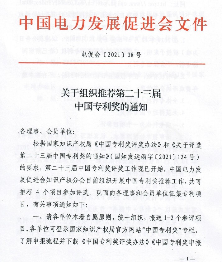 根據(jù)國家知識產權局《中國專利獎評獎辦法》和《關于評選第二十三屆中國專利獎的通知》(國知發(fā)運函字〔2021〕124號)的要求,第二十三屆中國專利獎評獎工作現(xiàn)已開始,中國電力發(fā)展促進會知識產權分會目前組織開展中國專利獎推薦工作,共可推薦4個項目參加評選?,F(xiàn)面向各理事和會員單位征集專利項目,有關事項通知如下: