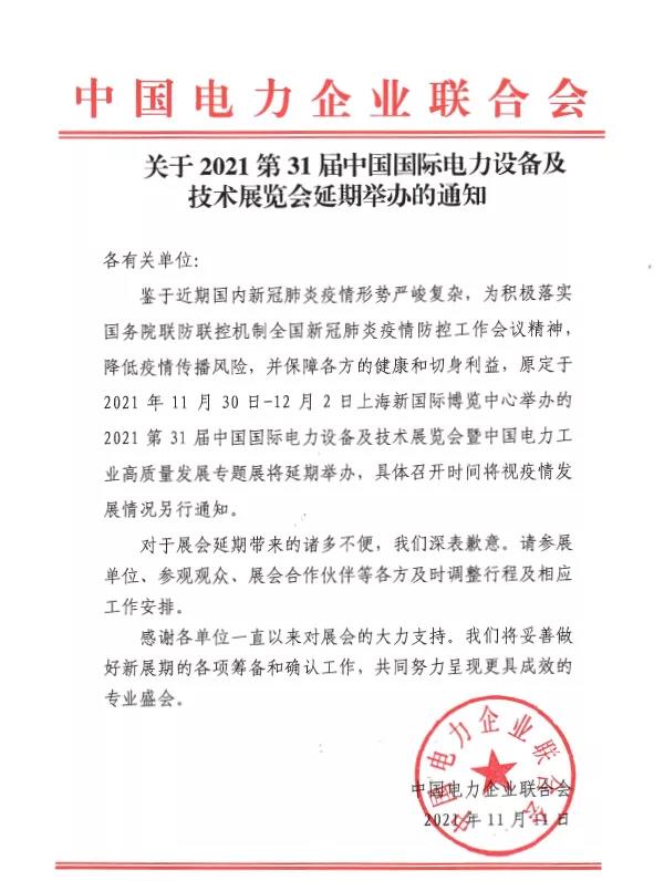 鑒于近期疫情防控形勢趨于嚴(yán)峻,為了貫徹落實國務(wù)院聯(lián)防聯(lián)控機(jī)制防疫要求,以所有參展商與觀眾的健康安全為首要考慮,同時保障展會效果,原定于 2021年11月30日至12月2日在上海新國際博覽中心舉辦的「第三十一屆上海國際電力設(shè)備及技術(shù)展覽會」暨「第二十三屆上海國際電工裝備展覽會」延期舉辦。具體延期方案將根據(jù)政府疫情防控規(guī)定另行通知。