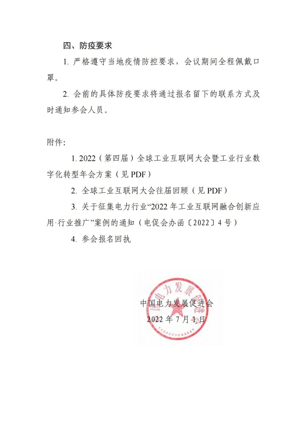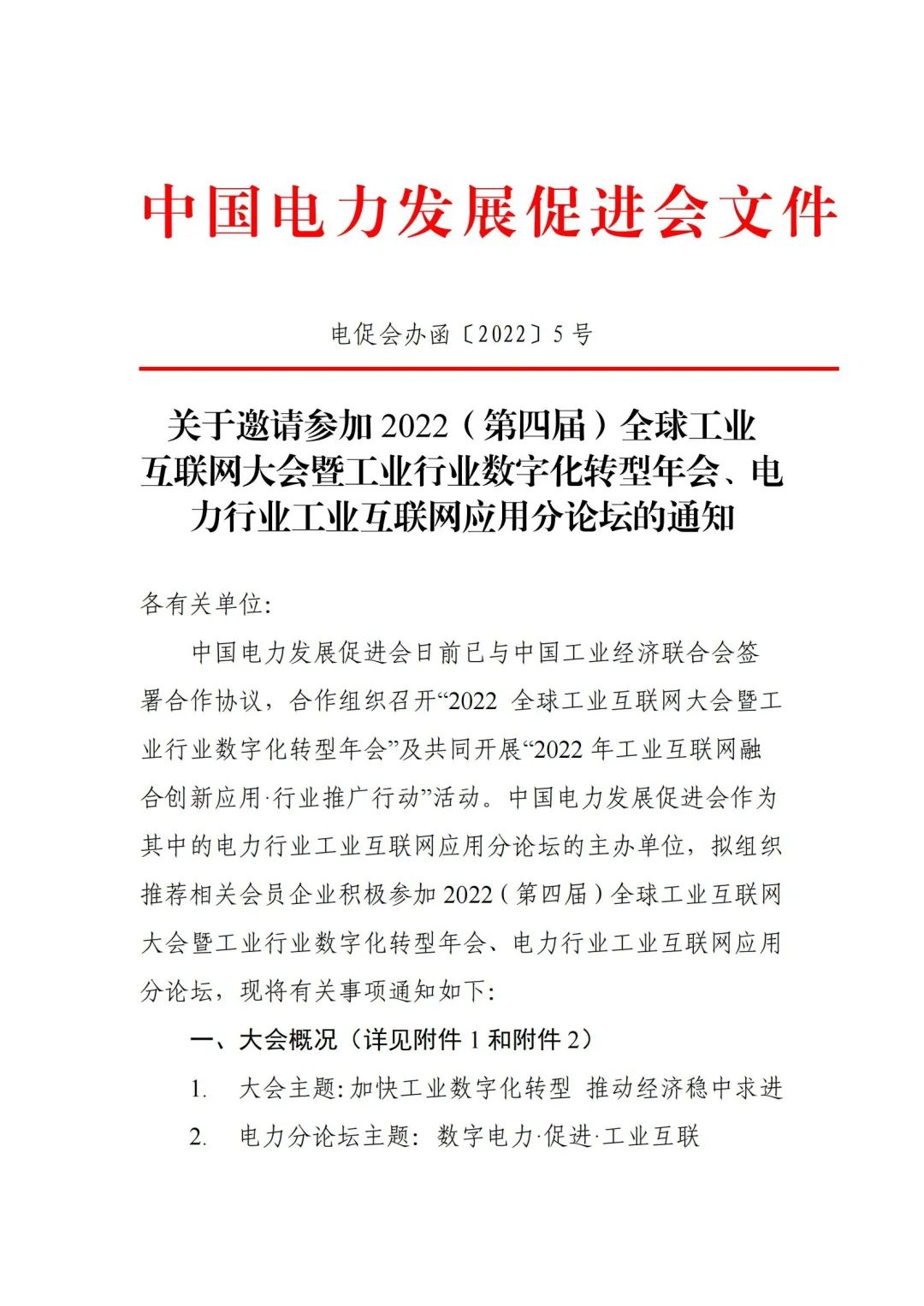 關(guān)于邀請參加 2022(第四屆)全球工業(yè) 互聯(lián)網(wǎng)大會暨工業(yè)行業(yè)數(shù)字化轉(zhuǎn)型年會、電力行業(yè)工業(yè)互聯(lián)網(wǎng)應(yīng)用分論壇的通知