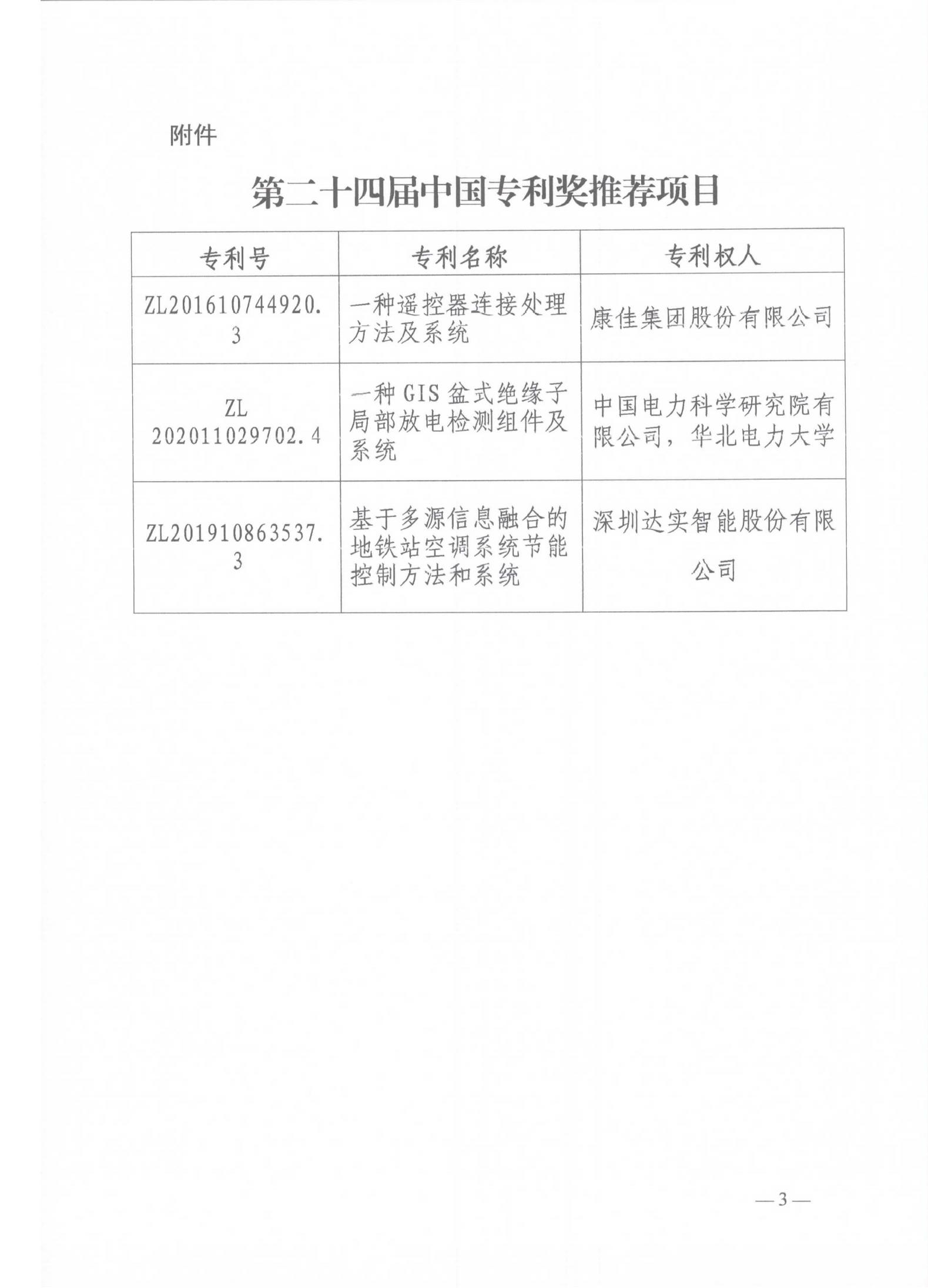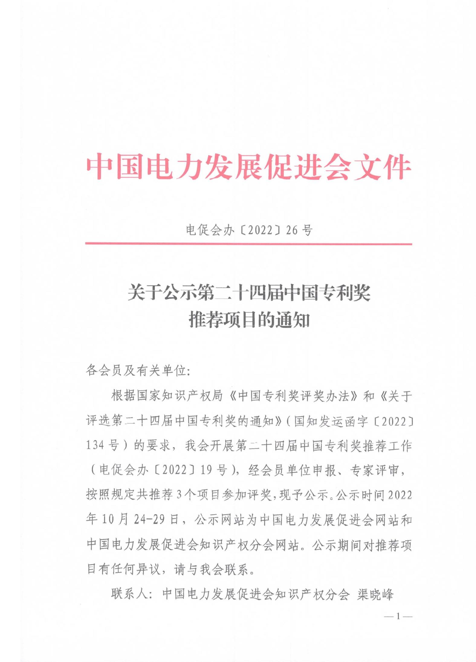 關(guān)于公示第二十四屆中國專利獎(jiǎng)推薦項(xiàng)目的通知