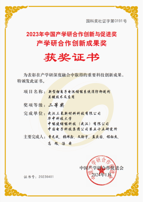近日,第十五屆中國產學研合作創(chuàng)新大會在北京舉行。中能建儲能科技(武漢)有限公司與武漢三氟新材料科技有限公司、華中科技大學、中國電子科技集團公司第五十五研究所等單位合作的“新型鋰離子電池儲能系統(tǒng)消防抑制劑關鍵技術及應用”榮獲2023年中國產學研合作創(chuàng)新與促進獎–產學研合作創(chuàng)新成果獎二等獎。