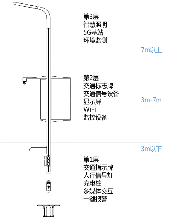 中電啟明星所開(kāi)發(fā)的智慧路燈主要采用模塊化分層級(jí)的桿體設(shè)計(jì),將路燈桿體分為頂部(>7米)、中部(3-7米)、下部(<3米)三個(gè)層次: