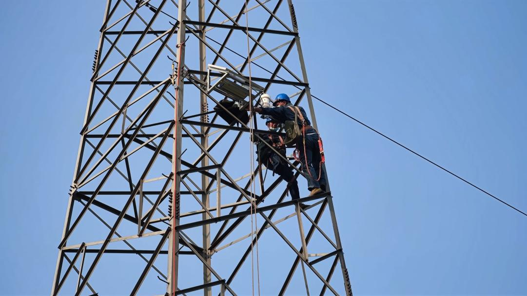 圖為作業(yè)人員正在為處于泄洪區(qū)的桿塔安裝電力北斗桿塔傾斜監(jiān)測終端