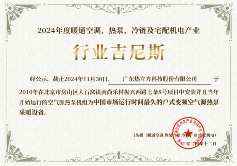 熱泵行業(yè)媒體i傳媒近日向熱立方地暖機(jī)頒發(fā)了一項(xiàng)榮譽(yù)——中國(guó)市場(chǎng)運(yùn)行時(shí)間最久的戶(hù)式變頻空氣源熱泵采暖設(shè)備。據(jù)了解,該設(shè)備于2010年在北京市房山區(qū)大石窩鎮(zhèn)南尚樂(lè)村振興西路七條8號(hào)項(xiàng)目中安裝,并且當(dāng)年開(kāi)始運(yùn)行,歷經(jīng)15個(gè)供暖季后,依然穩(wěn)定運(yùn)行無(wú)故障,創(chuàng)造了中國(guó)市場(chǎng)運(yùn)行時(shí)長(zhǎng)的行業(yè)紀(jì)錄。該項(xiàng)檢測(cè)由“建筑環(huán)能科技有限公司建筑環(huán)境與能源檢測(cè)院”完成檢測(cè)認(rèn)證。