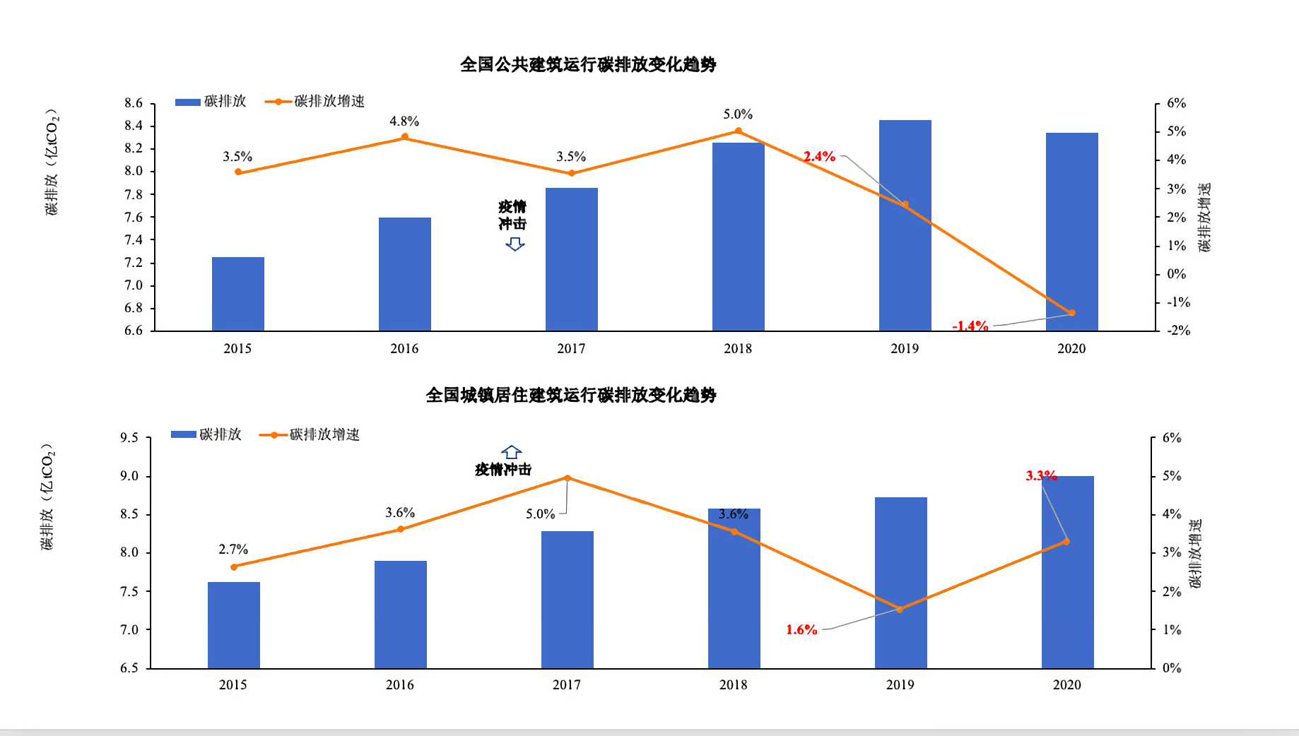 報(bào)告還披露,新冠疫情對建筑碳排放結(jié)構(gòu)也產(chǎn)生了影響。即公共建筑碳排放減少,而城鎮(zhèn)居住建筑碳排放增加。全國及多個(gè)省市2020年公共建筑碳排放總量出現(xiàn)下降現(xiàn)象,全國公共建筑碳排放下降1.4%。與此同時(shí),2020年全國居住建筑碳排放增速(3.3%)約是2019年增速的2倍(1.6%)。