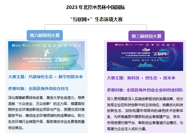 目前,北控水務(wù)杯第六屆中國國際“互聯(lián)網(wǎng)+”生態(tài)環(huán)境創(chuàng)新創(chuàng)業(yè)大賽(以下簡稱“雙創(chuàng)大賽”)和第三屆中國國際“互聯(lián)網(wǎng)+”生態(tài)環(huán)境科技創(chuàng)投大賽(以下簡稱“創(chuàng)投大賽”)兩場賽事報名通道已在北控水務(wù)集團官網(wǎng)(http://www.bewg.net/)正式開啟,報名截止日期為2023年10月10日,并擬定于12月初在南京大學(xué)舉辦現(xiàn)場總決賽。