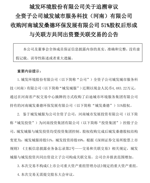 5月10日,城發(fā)環(huán)境公告,為進一步擴大省內(nèi)環(huán)衛(wèi)產(chǎn)業(yè)市場份額,同時減少同業(yè)競爭,公司全資子公司城發(fā)城服近期以現(xiàn)金人民幣4483.22萬元,通過在河南省產(chǎn)權交易中心摘牌的方式收購了啟迪城市環(huán)境服務集團有限公司持有的河南城發(fā)桑德環(huán)保發(fā)展有限公司51%股權。