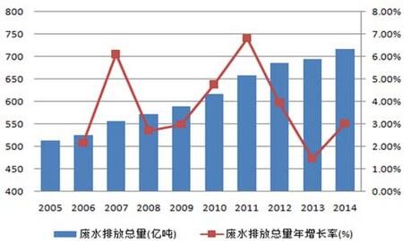 據(jù)統(tǒng)計,目前全國地表水體中Ⅰ類、Ⅱ類、Ⅲ類、Ⅳ類、Ⅴ類和劣Ⅴ類水質(zhì)占比分別為31%、30%、21%、6%、9%和3%,其中Ⅳ類及Ⅳ類以下水質(zhì)水體占比近4成,水質(zhì)污染問題嚴(yán)重。每年水質(zhì)污染給人體健康、工業(yè)生產(chǎn)、農(nóng)業(yè)生產(chǎn)和漁業(yè)養(yǎng)殖等方面造成的經(jīng)濟(jì)損失約2400億。。2014年全國廢水排放總量約為716億噸,較2005年的514億噸增長近4成,2005至2014十年間年復(fù)合增長率為3.4%,保持逐年穩(wěn)步增長。