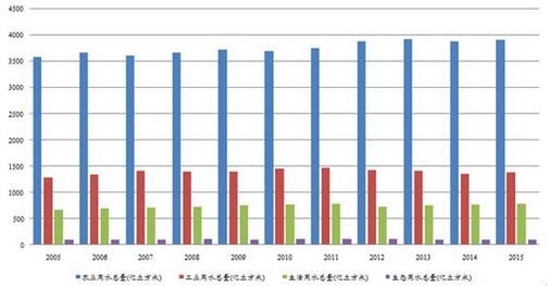 過去10年間,隨著人口增長,城市建設(shè)以及經(jīng)濟(jì)增長,全國用水總量總體呈現(xiàn)持續(xù)增長態(tài)勢,在2015年達(dá)到6180億立方米。(其中,由于首次進(jìn)行最嚴(yán)格水資源管理制度考核、以及農(nóng)業(yè)水價綜合改革和工業(yè)用水差別水價政策的推進(jìn),2014年的農(nóng)業(yè)和工業(yè)用水量分別出現(xiàn)下降,全國用水總量同時環(huán)比下降1.4%。)05至15年的用水總量年均復(fù)合增長率約為0.93%,據(jù)此計算到2030年全國用水總量將達(dá)到7100億立方米。這一預(yù)測與《全國水資源綜合規(guī)劃》劃定的2030年用水上限不超過7000億立方米基本一致。因此,在可預(yù)見的未來,用水量仍將繼續(xù)增長。
