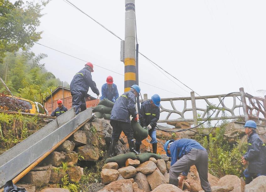 現(xiàn)場下著小雨,郭峰將隊員們分為2組,他和3名隊員利用電桿周圍石頭加固電桿底部,另外一組隊員負(fù)責(zé)填裝沙袋,并放在石頭頂部完成二次加固。