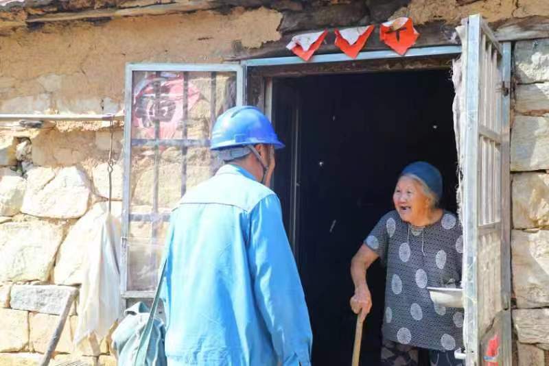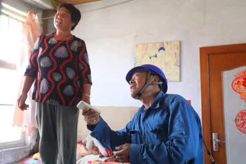土家窯自然村坐落在玖山腳下,半山腰上還有7戶老人,只有一條羊腸小道能到達(dá)。7月7日下午,山上的王繼福托人打電話,說家里沒電了,水缸也空了,沒法抽水。遲玉朋急匆匆趕了去,92歲的王繼福和老伴已經(jīng)挑不動水了,老倆口只能靠電機抽水用。遲玉朋扛著梯子、背著工具包,從山下爬到山腰,午后天氣超乎異常的悶熱,汗水很快浸透衣服。