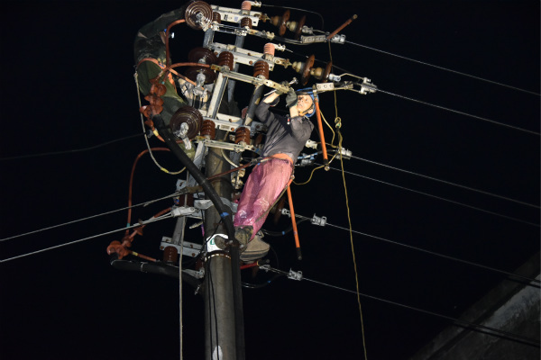 該線路斷線區(qū)域處于陡坡地勢復雜,且雨天較滑,搶修放線工作難度較大。在各部門的討論部署下,23名搶修人員做好搶修準備工作趕往現場。盡管多方面原因導致搶修難度大、任務重,但搶修人員毫無怨言,大家只想讓停電用戶能夠盡早用上電。雨勢稍有減停,晚上8時在調度部門的許可下斷開10千伏亨泰線開關,搶修人員做好相關安全防護措施,搶修工作有序進行......